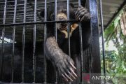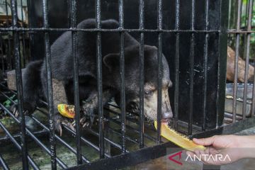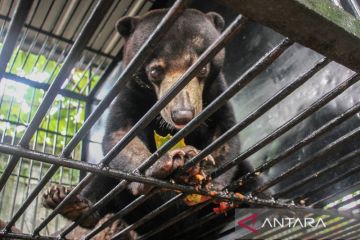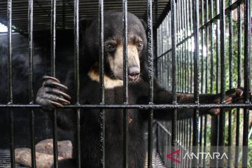 Seekor Beruang Madu (Helarctos Malayanus) berada di dalam kandang transit Balai Konservasi Sumber Daya Alam (BKSDA) Kalimantan Tengah, Palangka Raya, Rabu (11/6/2025). BKSDA Kalteng menerima seekor Beruang Madu berusia sekitar tiga tahun serahan dari warga Kota Palangka Raya dan satwa dilindungi tersebut akan direhabilitasi sebelum dilepasliarkan ke habitatnya. ANTARA FOTO/Auliya Rahman.
