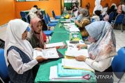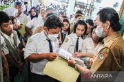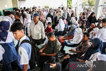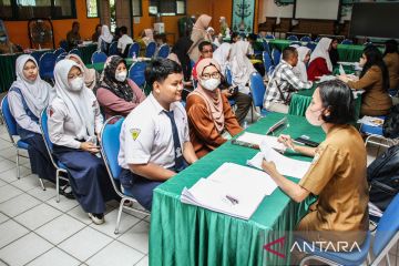 Sejumlah siswa dan orang tua siswa antre untuk menyerahkan berkas pendaftaran Penerimaan Murid Baru (SPMB) di SMKN 3 Palangka Raya, Kalimantan Tengah, Senin (23/6/2025). Dinas Pendidikan Provinsi Kalimantan Tengah membuka SPMB jenjang SMK/SMA secara daring pada 23-26 Juni 2025 dengan sistem penerimaan jalur domisili minimal kuota 35 persen, jalur afirmas minimal 30 persen, jalur prestasi minimal 30 persen, dan jalur mutasi minimal 5 persen. ANTARA FOTO/Auliya Rahman/YU.