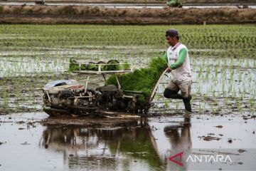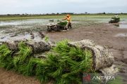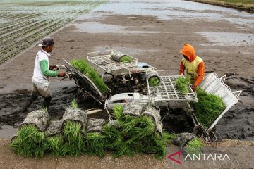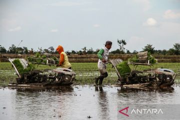 Petani mengambil bibit padi untuk ditanam menggunakan mesin di lahan food estate, Pulang Pisau, Kalimantan Tengah, Selasa (4/11/2025). Kementerian Pertanian menargetkan cetak sawah di Kalimantan Tengah Tahun 2025 seluas 53 ribu hektare, dimana hingga Oktober progres yang sudah tergarap mencapai 25 persen, sebagai upaya mewujudkan program swasembada pangan. ANTARA FOTO/Auliya Rahman.