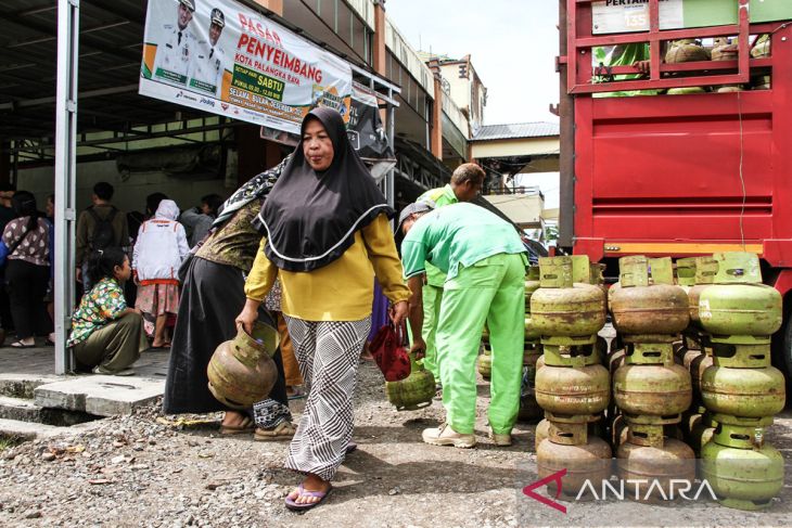 Warga membawa gas LPG 3 kilogram saat operasi pasar penyeimbang di Pasar Datah Manuah, Palangka Raya, Kalimantan Tengah, Sabtu (13/12/2025). Pemerintah Kota Palangka Raya menggelar pasar penyeimbang setiap hari sabtu selama bulan Desember 2025 dengan menyediakan 200 tabung gas LPG 3 kilogram pada setiap operasinya, yang dijual dengan harga eceran tertinggi (HET) yakni Rp22 ribu sebagai upaya stabilisasi pasokan dan harga menjelang perayaan Natal 2025 dan Tahun Baru 2026. ANTARA FOTO/Auliya Rahman