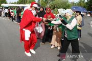 Peserta menegenakan kostum sinterklas membagikan permen kepada pengunjung saat mengikuti Parade Natal 2025 di Bundaran Besar, Palangka Raya, Kalimantan Tengah, Sabtu (13/12/2025). Parade yang diikuti ribuan pe serta dari kalangan pelajar, mahasiswa, dan elemen umat Kristiani tersebut untuk menyambut suka cita Natal 2025. ANTARA FOTO/Auliya Rahman