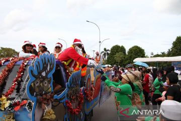 Peserta menegenakan kostum sinterklas membagikan permen kepada pengunjung saat mengikuti Parade Natal 2025 di Bundaran Besar, Palangka Raya, Kalimantan Tengah, Sabtu (13/12/2025). Parade yang diikuti ribuan pe serta dari kalangan pelajar, mahasiswa, dan elemen umat Kristiani tersebut untuk menyambut suka cita Natal 2025. ANTARA FOTO/Auliya Rahman.