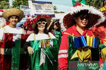Peserta mobil hias mengikuti Parade Natal 2025 di Bundaran Besar, Palangka Raya, Kalimantan Tengah, Sabtu (13/12/2025). Parade yang diikuti ribuan peserta dari kalangan pelajar, mahasiswa, dan elemen umat Kristiani tersebut untuk menyambut suka cita Natal 2025. ANTARA FOTO/Auliya Rahman.