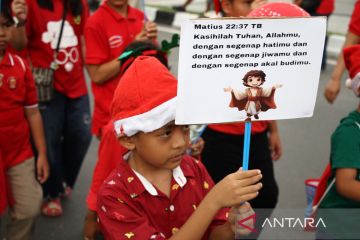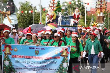 Peserta mengikuti Parade Natal 2025 di Bundaran Besar, Palangka Raya, Kalimantan Tengah, Sabtu (13/12/2025). Parade yang diikuti ribuan peserta dari kalangan pelajar, mahasiswa, dan elemen umat Kristiani tersebut untuk menyambut suka cita Natal 2025. ANTARA FOTO/Auliya Rahman