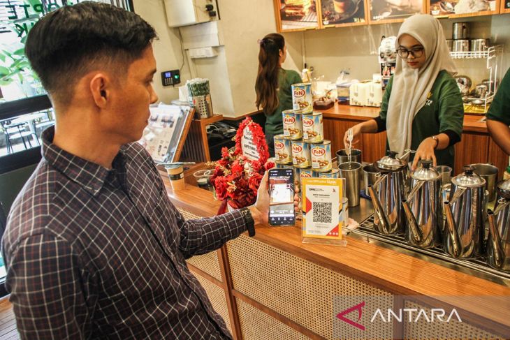Pembeli melakukan transaksi pembayaran menggunakan Quick Response Code Indonesian Standard (QRIS) di salah satu kafe di Palangka Raya, Kalimantan Tengah, Jumat (9/1/2026). Bank Indonesia menargetkan Tahun 2026 transaksi QRIS mencapai 17 miliar dengan perluasan QRIS antarnegara menjangkau ke delapan negara, serta menyasar 45 juta merchant dan 60 juta pengguna. ANTARA FOTO/Auliya Rahman