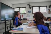 Seorang guru menyampaikan materi kepada siswa menggunakan smart board atau papan tulis interaktif saat mengikuti kegiatan belajar mengajar di Sekolah Rakyat Palangka Raya, Kalimantan Tengah, Selasa (20/1/2026). Presiden Prabowo Subianto menargetkan pembangunan 500 Sekolah Rakyat hingga Tahun 2029 dalam upaya memberikan pendidikan gratis untuk menekan angka putus sekolah dan meningkatkan kualitas pendidikan. ANTARA FOTO/Auliya Rahman