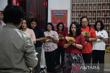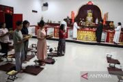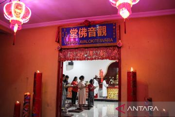 Warga keturunan Tionghoa bersembahyang menyambut tahun baru imlek di Vihara Avalokitesvara, Palangka Raya, Kalimantan Tengah, Senin (16/2/2026). Sembahyang malam pergantian tahun baru imlek 2577 Kongzili tersebut sebagai momentum untuk berdoa dan berharap kehidupan yang lebih baik di tahun Kuda Api. ANTARA FOTO/Auliya Rahman.
