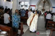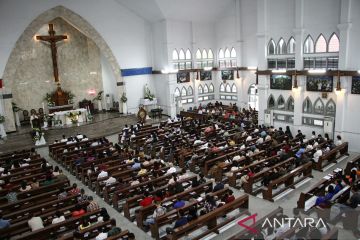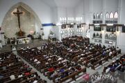 Umat Katolik berdoa saat mengikuti ibadah Hari Raya Paskah di Gereja Katedral, Palangka Raya, Kalimantan Tengah, Minggu (5/4/2026). Ibadah Hari Raya Paskah di Gereja Katedral pada sesi pagi yang diikuti sekitar 800 umat tersebut memaknai kebangkitan Tuhan Yesus menyelamatkan umat di dunia. ANTARA FOTO/Auliya Rahman.