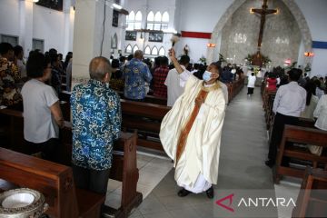 Pastor Patrisius Alu Tampu memercikan air suci pemberkatan janji baptis kepada umat saat ibadah Hari Raya Paskah di Gereja Katedral, Palangka Raya, Kalimantan Tengah, Minggu (5/4/2026). Ibadah Hari Raya Paskah di Gereja Katedral pada sesi pagi yang diikuti sekitar 800 umat tersebut memaknai kebangkitan Tuhan Yesus menyelamatkan umat di dunia. ANTARA FOTO/Auliya Rahman