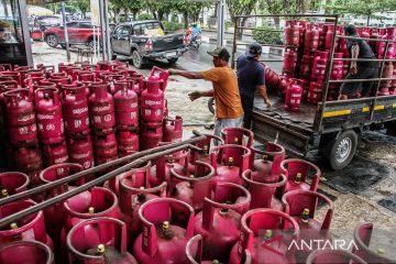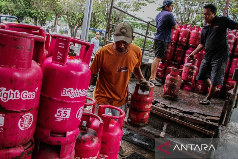Pekerja menurunkan tabung elpiji di salah satu pangkalan di Palangka Raya, Kalimantan Tengah, Rabu (22/4/2026). Kementerian Energi dan Sumber Daya Mineral (ESDM) menyebutkan, meskipun kebutuhan elpiji nasional pada Tahun 2026-2027 diperkirakan mencapai 10 juta ton atau mengalami kenaikan dibanding konsumsi tahun sebelumnya sebanyak 8,6 juta ton, namun pemerintah memastikan ketersediaan elpiji di indonesia dalam kondisi aman. ANTARA FOTO/Auliya Rahman.